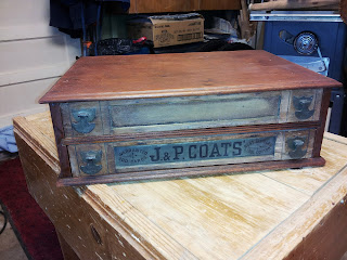 It's going to go home with a new zest for life--a marvelous, mature J&P Coats 1870's Thread Box...and strutting its stuff in the 21st century!